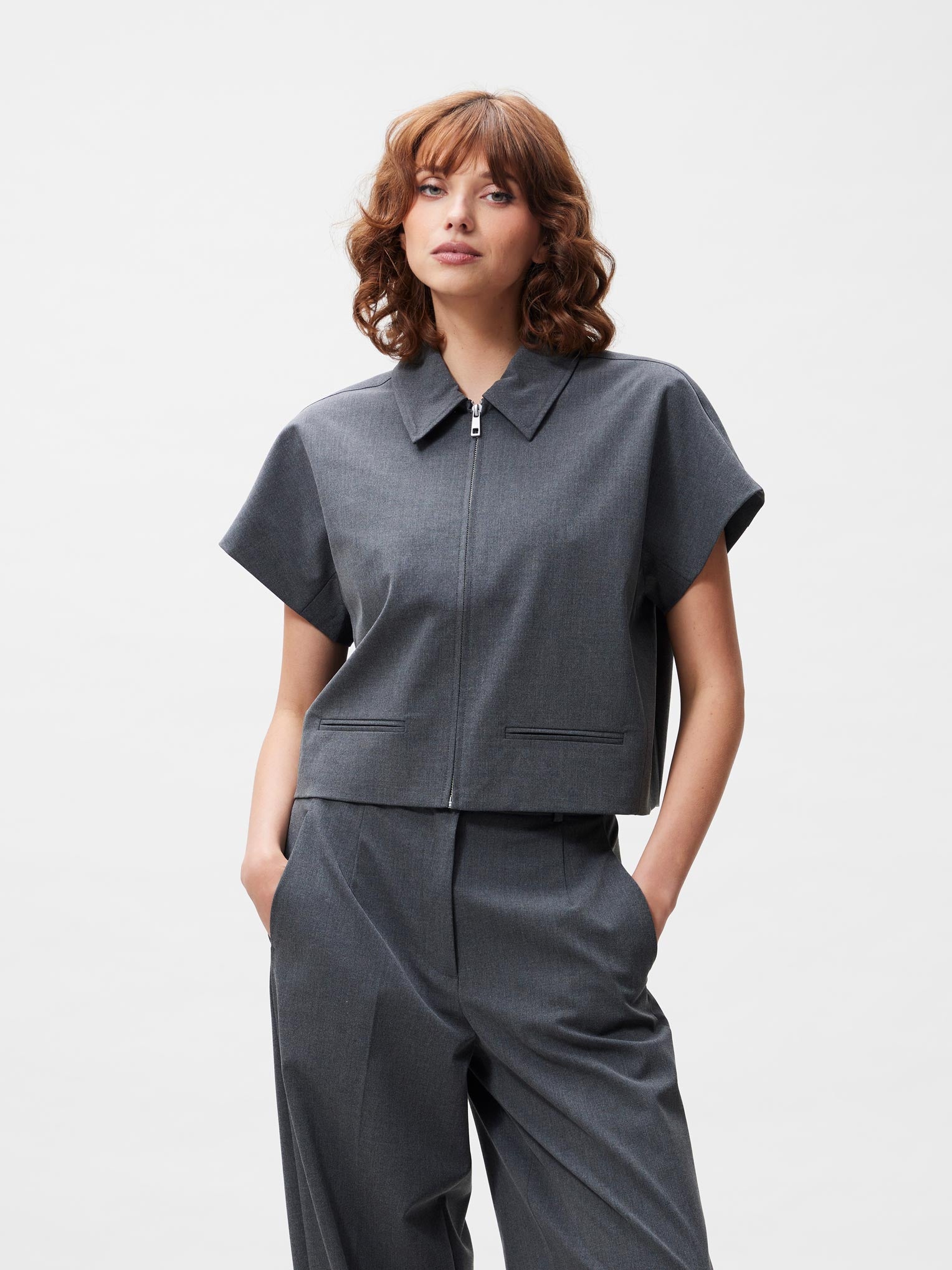 • This short sleeve jacket is fully lined. The jacket is styled with a zipper at the front. Pair it with the Tailored Trousers for a matching look.